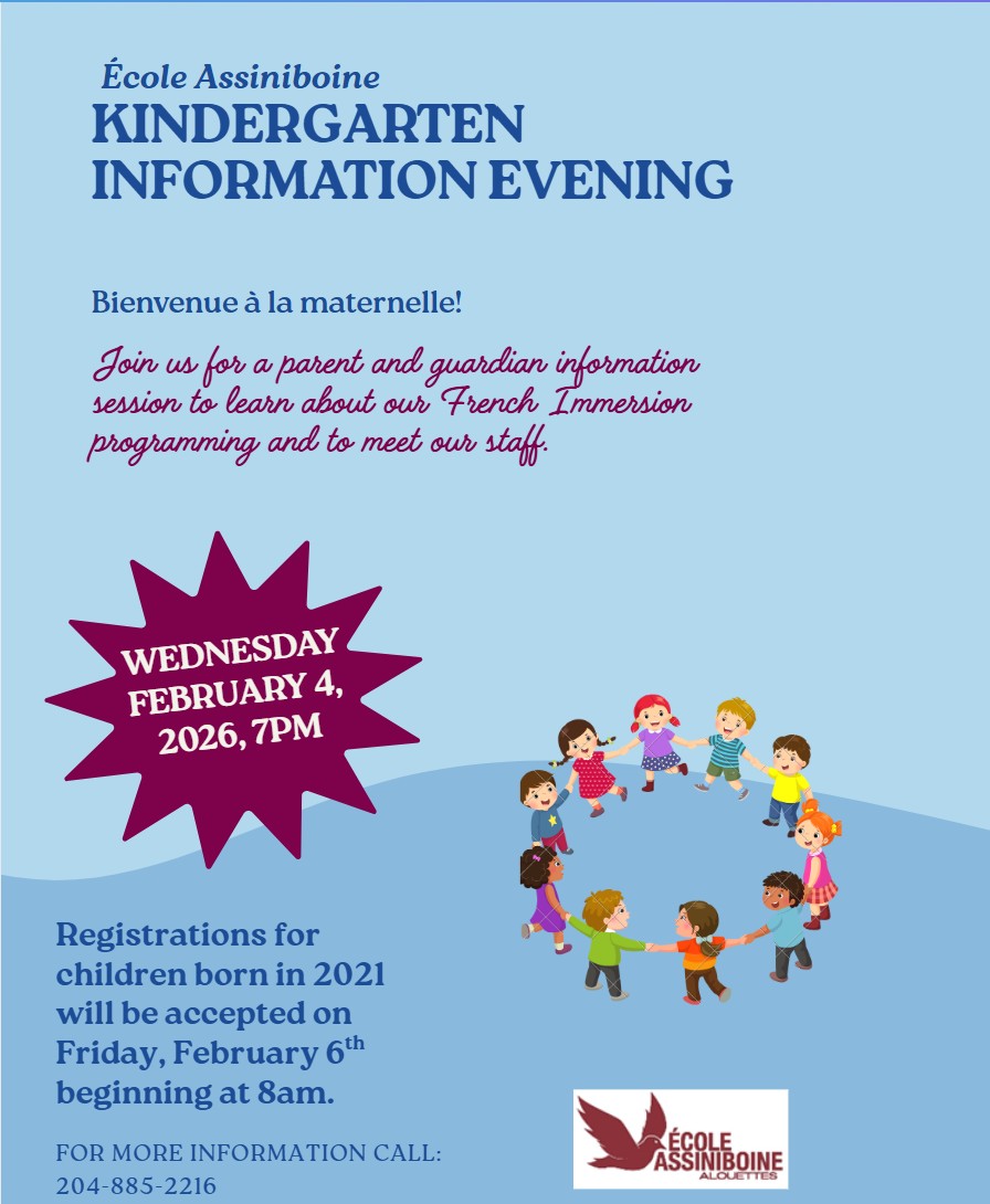 We are hosting a Welcome to Kindergarten evening for students registered for kindergarten at École Assiniboine starting in September 2018. There will be lots of fun activities and a bag full of goodies to take home to use during the summer. Date: Tuesday, May 15th Time: 6:00 PM Place: École Assiniboine gymnasium...