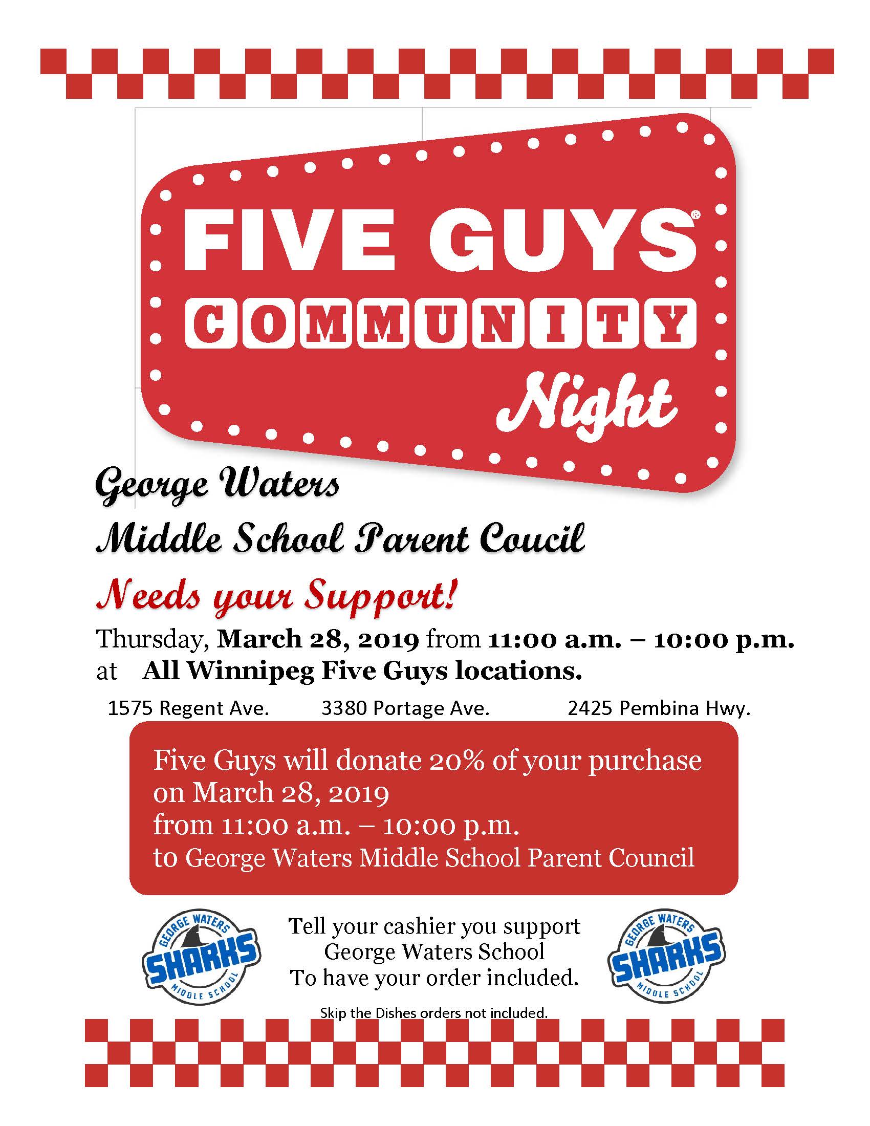 Come support George Waters Middle School on March 28th from 11-10pm. Five Guys will donate 20% of your purchases to Parent Council, just tell your cashier you support George Waters!