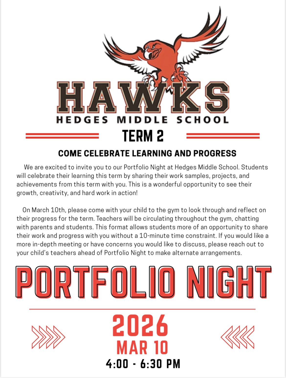 You're invited to Portfolio Night at Hedges Middle School on Tuesday, November 4th from 4pm-7 pm ! Students will share their projects, work samples, and achievements from the term. Come to the gym with your child to explore their progress and celebrate their hard work in a relaxed, open format. If you'd like a...